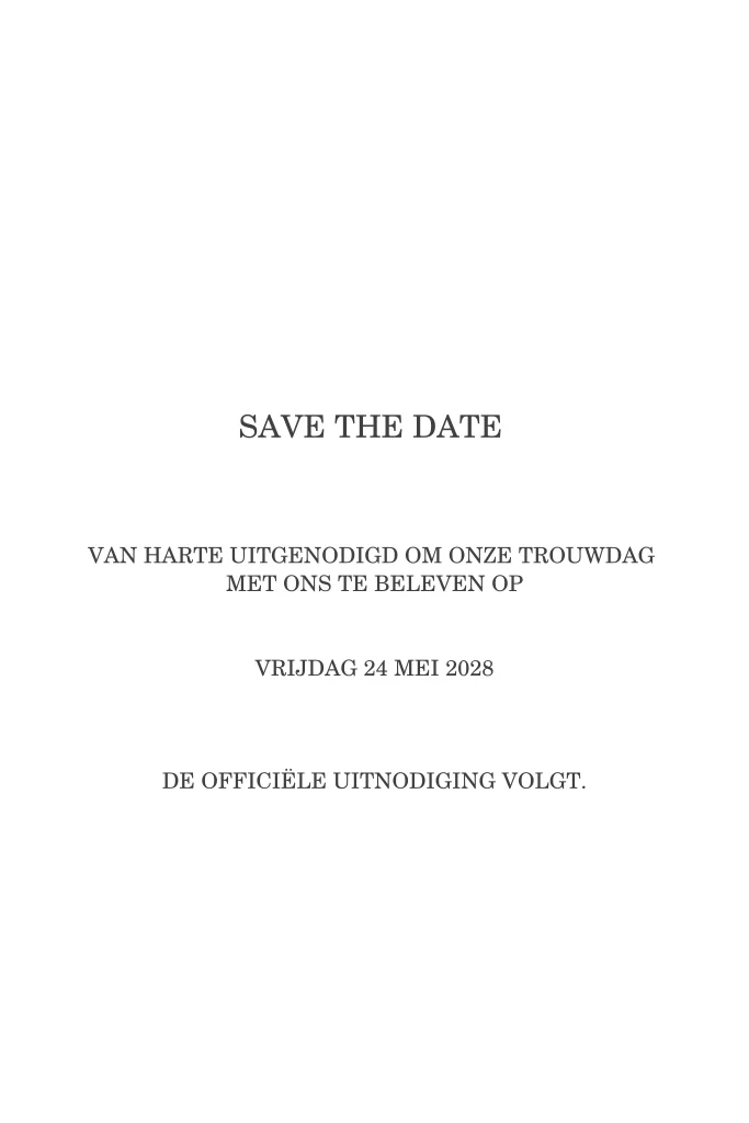 De initialen op deze klassieke Save the Date kaart worden met goudfolie gedrukt. Deze goudfolie ligt op de Save the Date kaart. In de kaartopmaker kun je een mooie combinatie maken van jullie initialen.