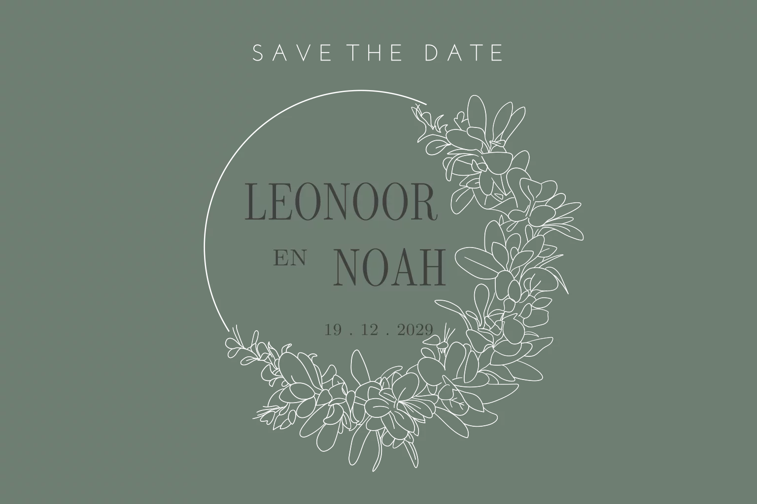 Stijlvolle Save the Date kaart met lief kransje. Wij hebben gekozen voor een donker groene achtergrond, maar in de kaartopmaker kun je dit aanpassen naar elke gewenste kleur.