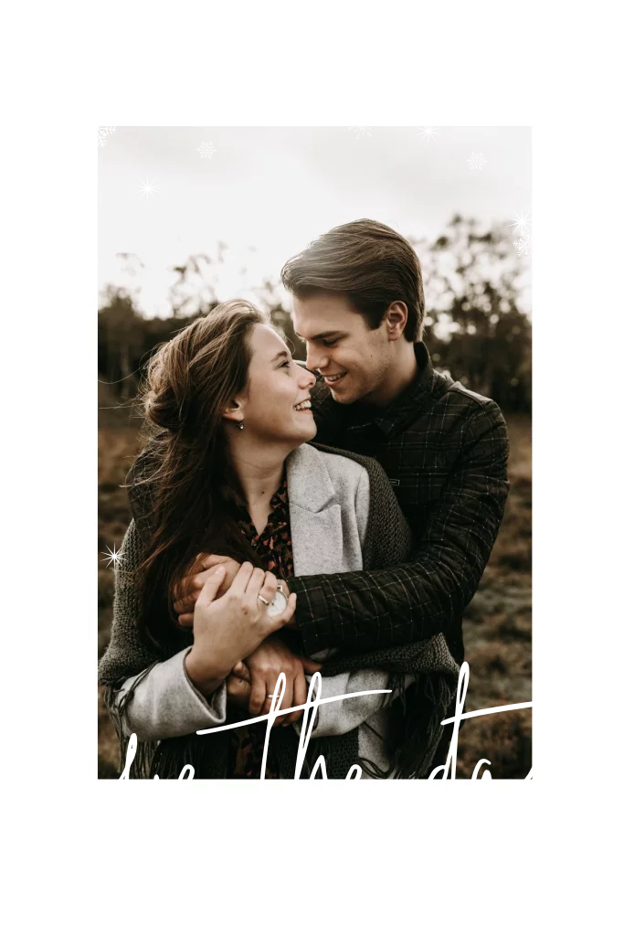 Een kerstkaart en Save the Date in één: liefdevolle kerstgroet en aankondiging van jullie trouwdatum. Upload op de voorkant jullie eigen foto. Over de gehele kerstkaart worden sterretjes in zilverfolie gedrukt.
