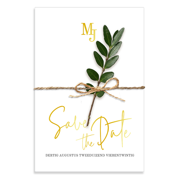 Een chique Save the Date kaart me touwtje, takje en folie. De goudfolie zorgt voor een mooie glans op de kaart.