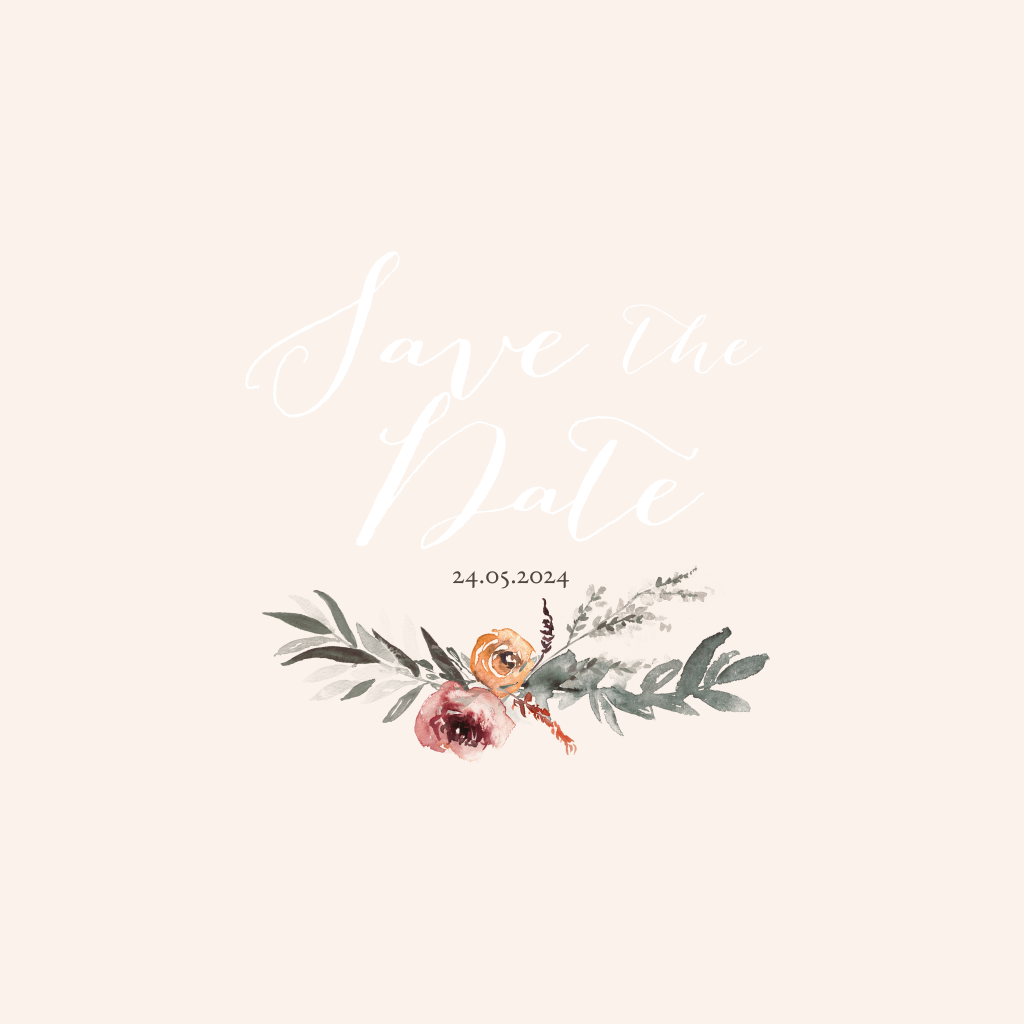 Een stijlvolle Save the Date met mooie letters in goudfolie. Wij hebben dit takje er onder geplaatst, maar andere takjes zijn ook mogelijk. Deze kun je toevoegen als je in de kaartopmaker bent en naar de map met AFBEELDINGEN EN VERSIERINGEN gaat.