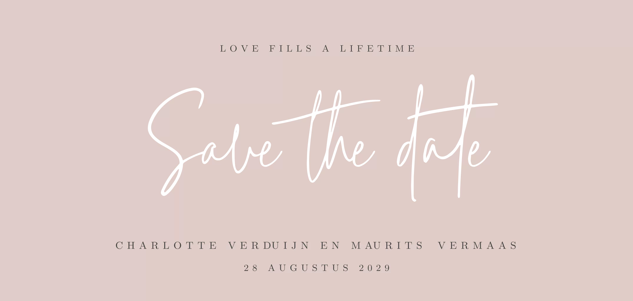 Laat deze Save the Date kaart drukken op het formaat 10 bij 21 cm en je ontvangt een kaart met prachtige roséfolie. Een kleiner formaat is niet mogelijk.