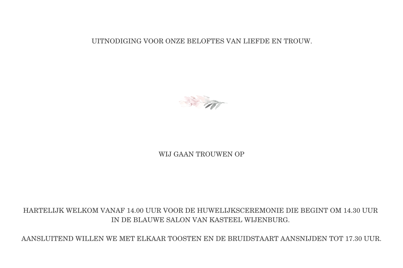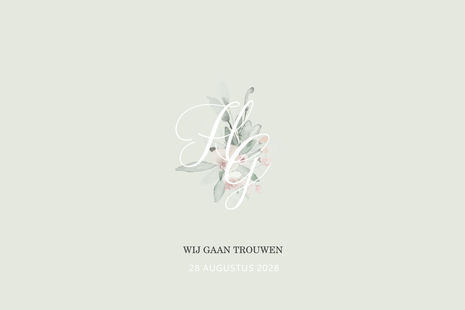 Dit is een klassieke trouwkaart met jullie initialen op de voorkant. In de kaartopmaker kun je jullie eigen initialen invullen. Op de achtergrond staat een lief bloemetje? Liever een andere kleurstelling? In de beeldbank vind je veel afbeeldingen van bloemetjes.