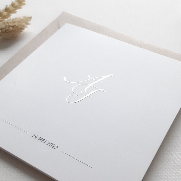 De initialen op deze klassieke trouwkaart worden met goudfolie gedrukt. Deze goudfolie ligt op de trouwkaart. In de kaartopmaker kun je een mooie combinatie maken van jullie initialen.