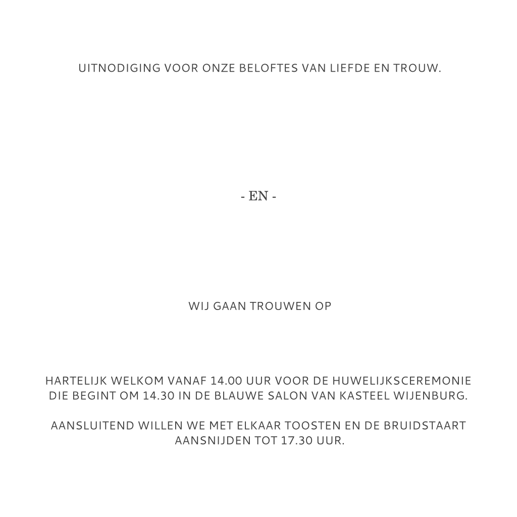 Laat goudfolie op jullie trouwkaart drukken voor een chique stijl en sfeer. In de kaartopmaker kun je een eigen ontwerp maken met dit voorbeeld. Het programma is met icoontje weergegeven. We hebben in de beeldbank verschillende mappen met icoontjes. Zo maak je altijd een mooi programma voor jullie bruiloft.