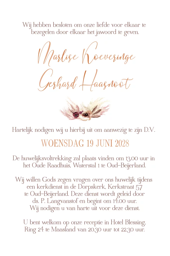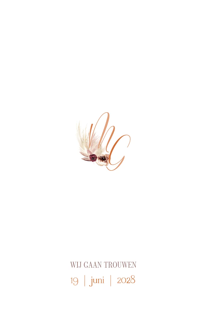 Een klein detail van droogbloemen hebben we bij de initialen geplaatst. Je kunt in de kaartopmaker ook andere bloemen details kiezen. De initialen worden met hoogglans gedrukt voor een chique uitstraling.