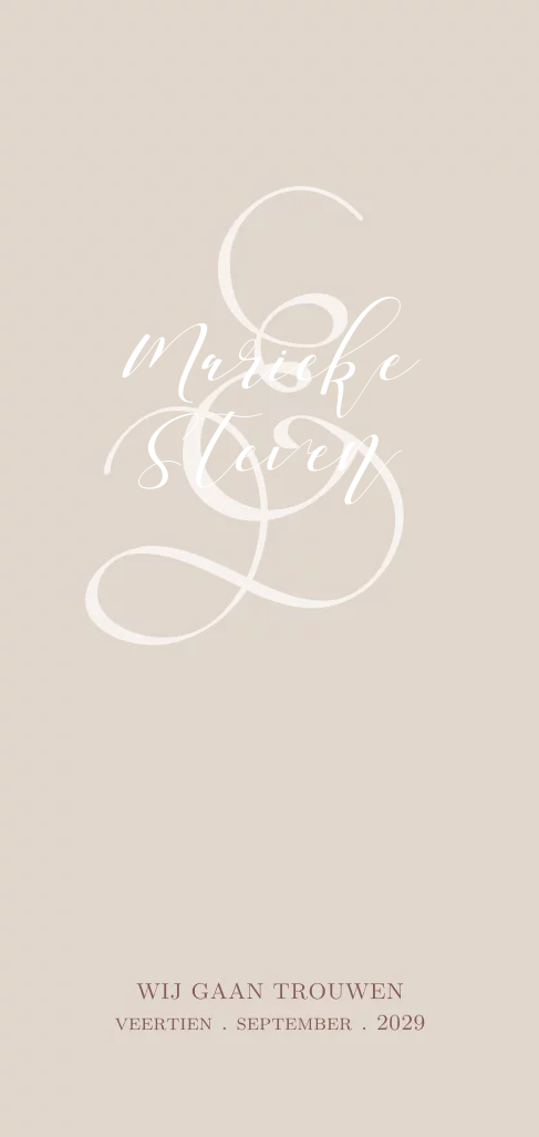 Plaats jullie eigen namen op deze langwerpige trouwkaart met goudfolie. Het en-teken geeft een klassieke uitstraling op deze trouwkaart met een gekleurde achtergrond. Alles teksten en kleuren zijn aan te passen in de kaartopmaker.