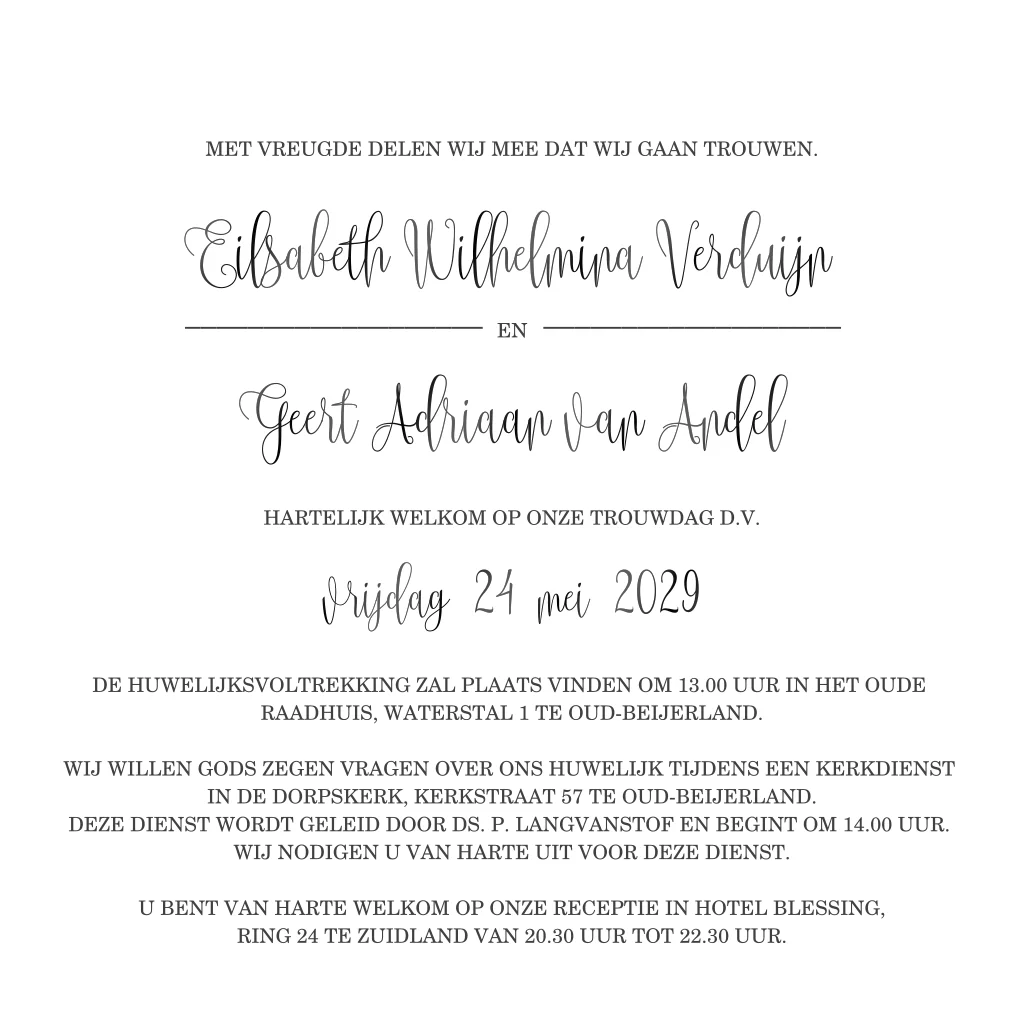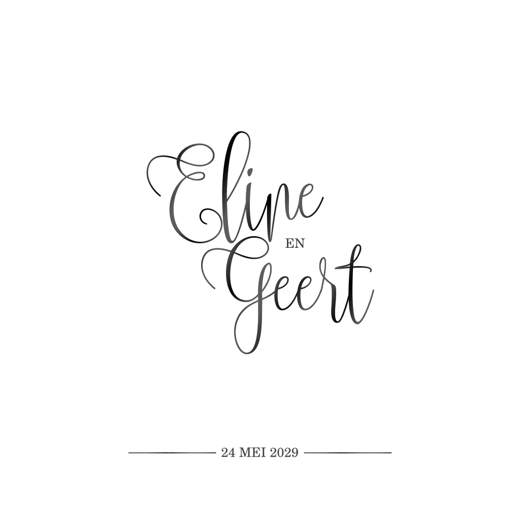 Jullie namen wordt op deze klassieke trouwkaart met zwartfolie gedrukt. Deze zwartfolie ligt op de trouwkaart. Je zou bij deze trouwkaart ook nog houten hartjes kunnen bestellenz zodat je echt een unieke trouwkaart maakt.