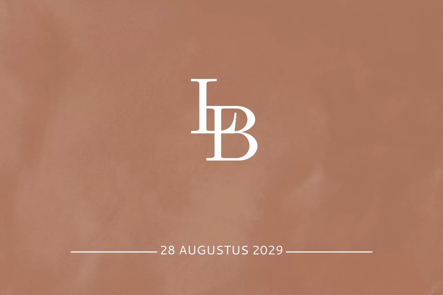 Een moderne trouwkaart met zilverfolie en roestbruine achtergrond. We hebben gekozen voor een strak lettertype voor de initialen. Jullie kunnen zelf in de kaartopmaker een logo maken met jullie initialen. Laat deze terugkomen op al jullie drukwerk voor de bruiloft.