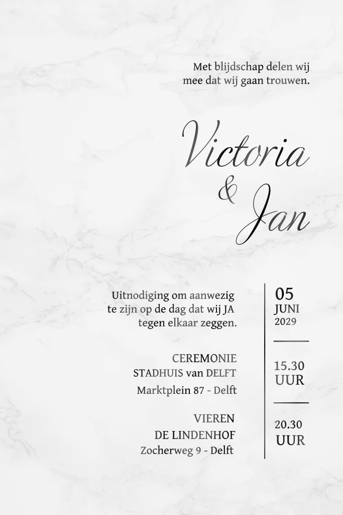Een moderne trouwkaart met mooie opmaak van het dagprogramma. Past jullie programma ook op deze kaart? Als het niet past, mag je ons altijd vragen voor aanpassingen.