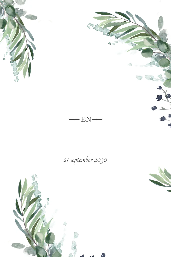Deze trouwkaart met eucalyptus maakt deel uit van een trouwkaartenset.