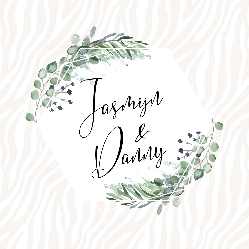 Verschillende trend details komen terug in deze ene mooie trouwkaart. Een geometrisch figuur met echt goudfolie. De speelse zebra print op de achtergrond die ook in kleur aan te passen is. En onze mooie eucalyptus blaadjes.