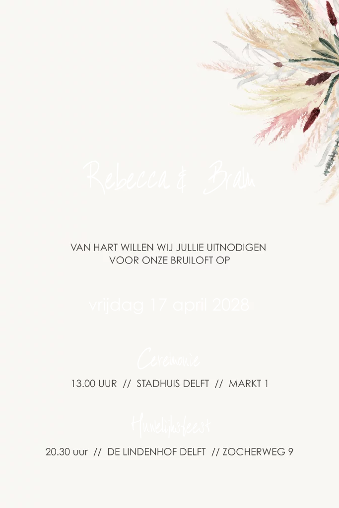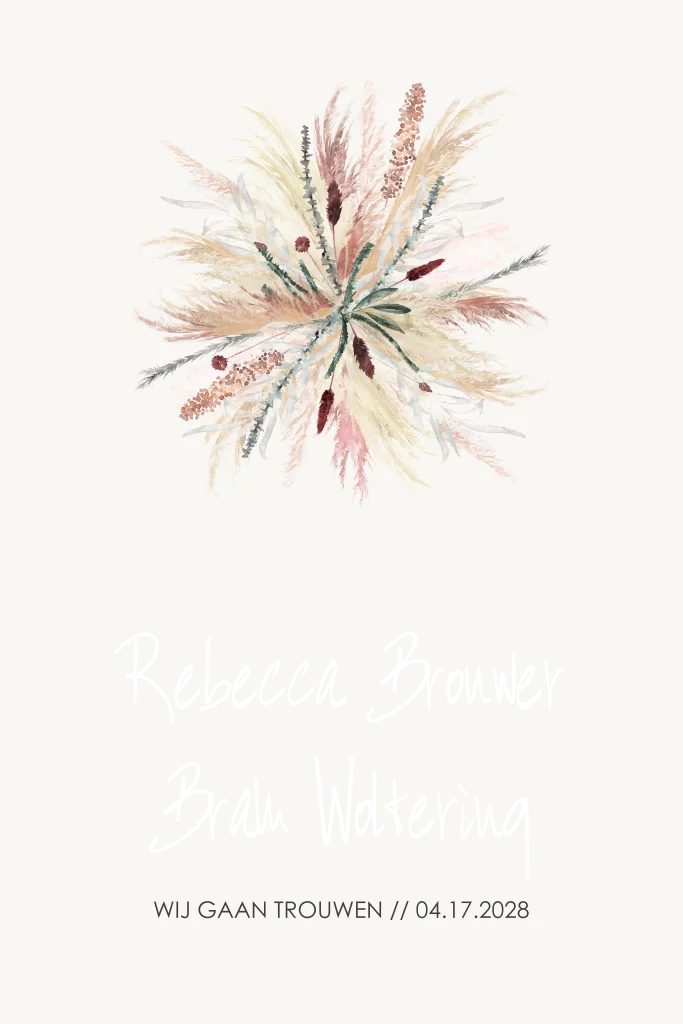 Een trend trouwkaart met een Flower Cloud van droogbloemen. Mooie kleurtinten die goed kunnen passen bij de stijl en sfeer van jullie bruiloft.