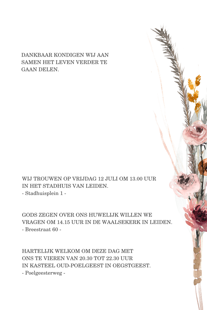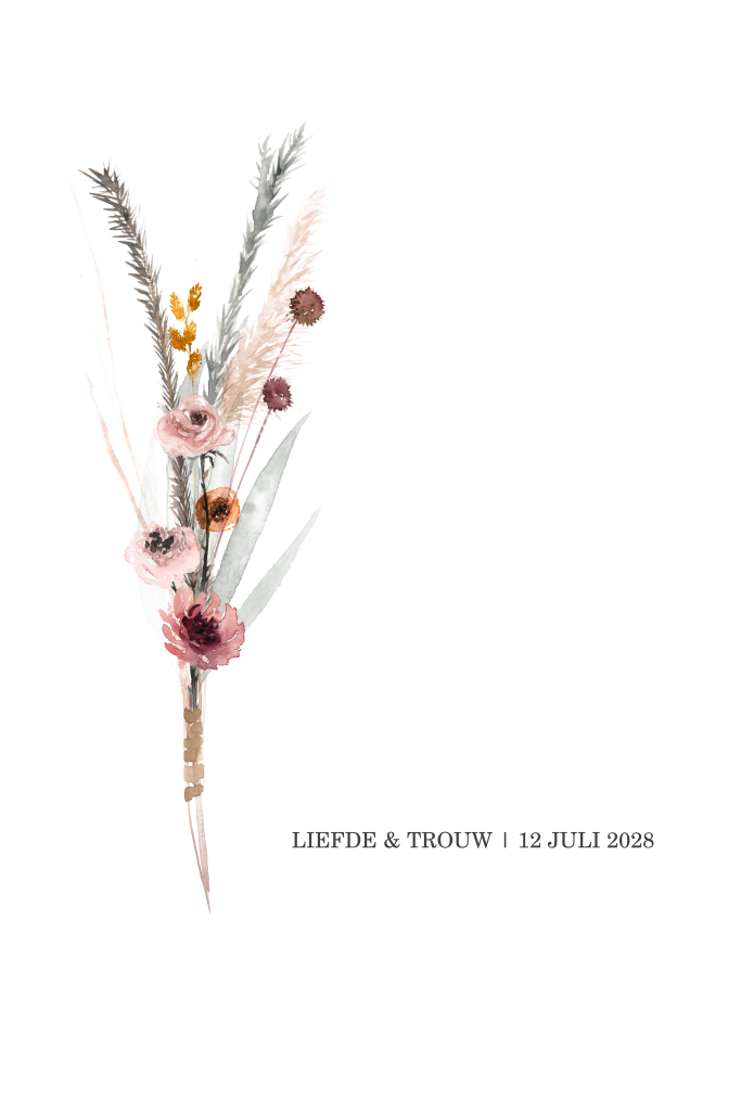 Trouwkaart met boeketje droogbloemen en goudfolie