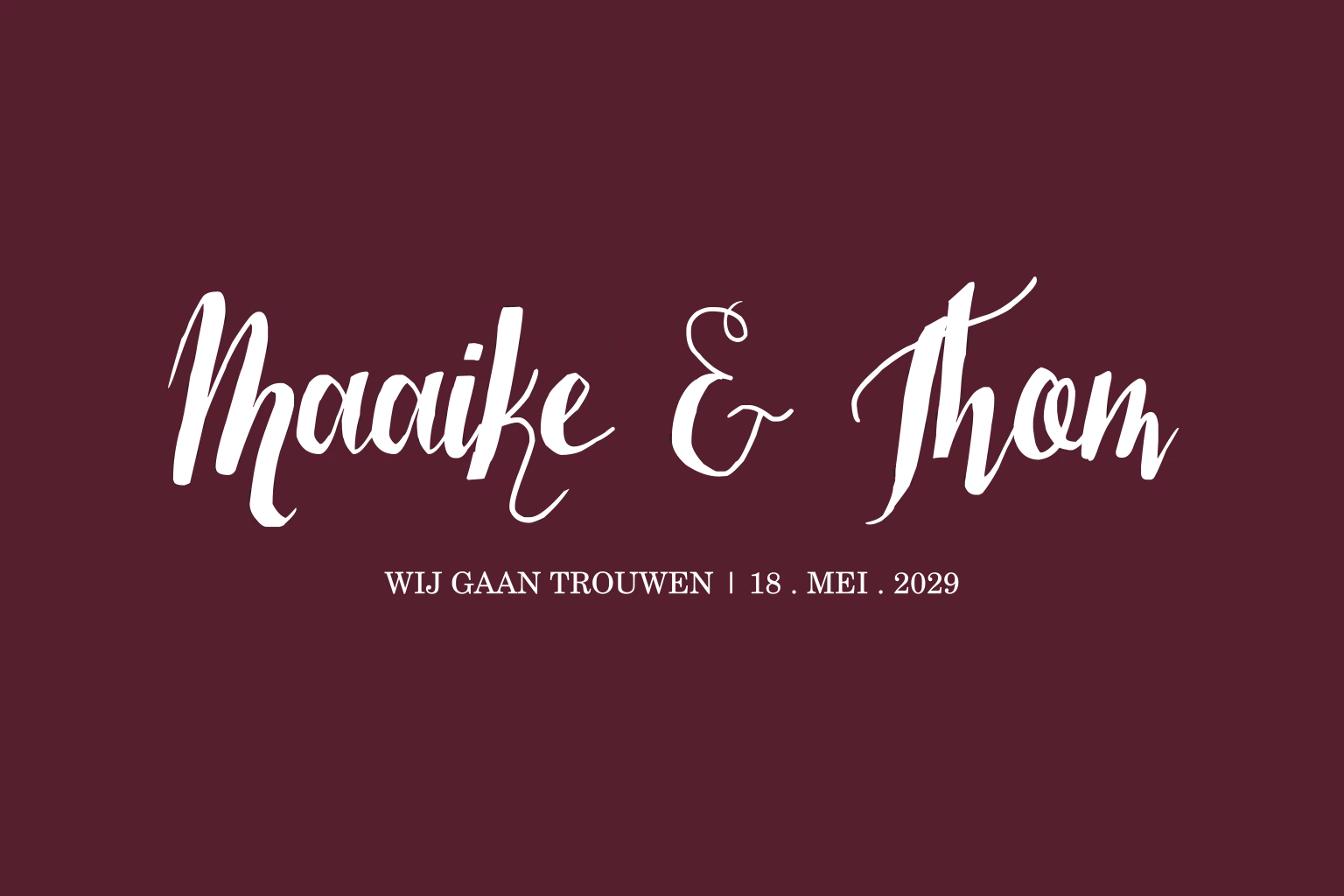 Een prachtige kleur burgundy heeft deze trouwkaart in roséfolie. In de editor kun je elke andere gewenst kleur kiezen.
