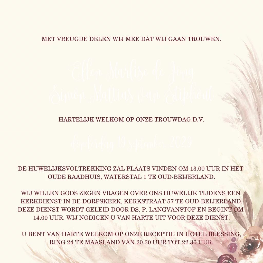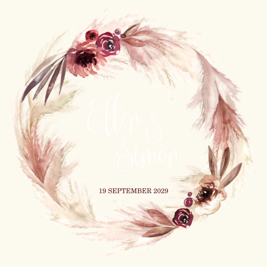 In het kransje van droogbloemen zie je veel grassen en gedroogde donker rode bloemetjes. Jullie namen worden met roséfolie gedrukt. Past deze trend bij jullie bruiloft? Maak dan een mooie ontwerp in de kaartopmaker.