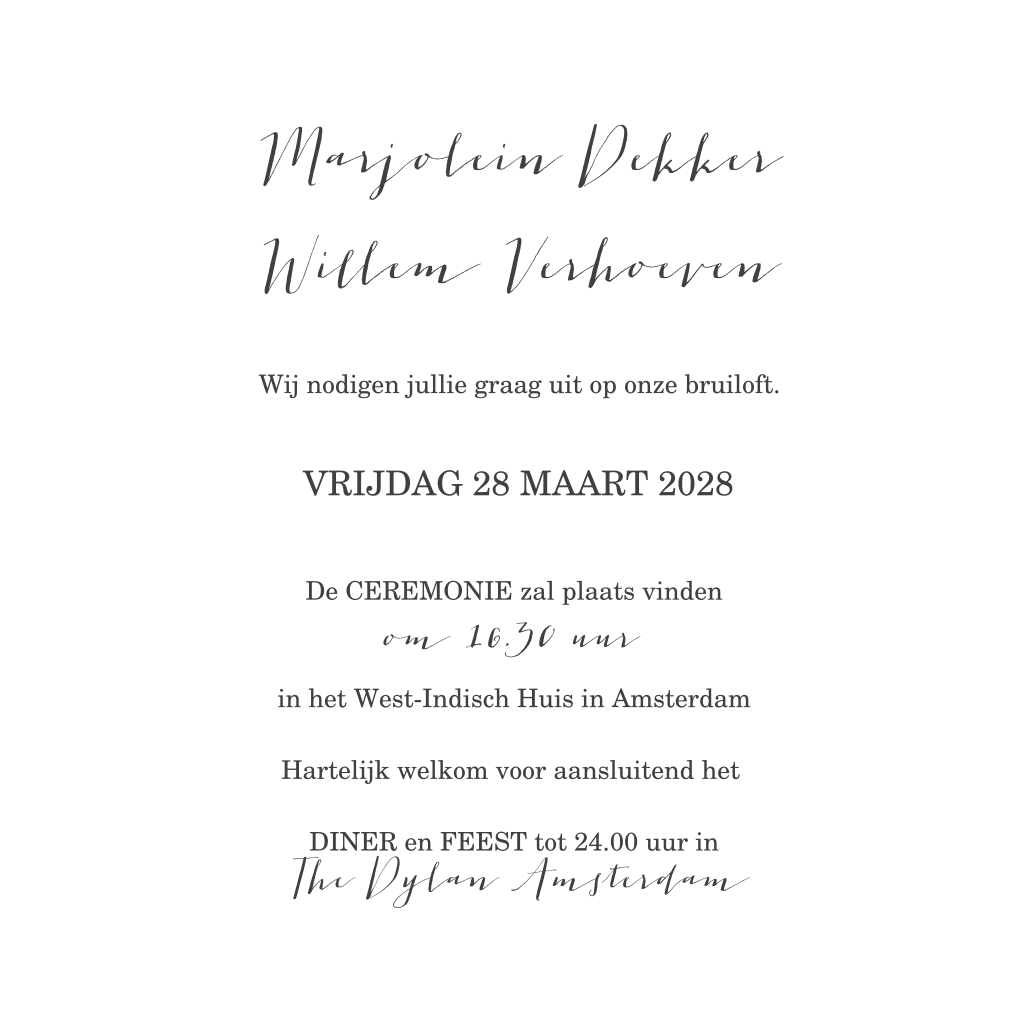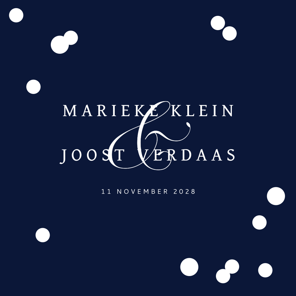 Klassieke vierkante trouwkaart met donkerblauwe achtergrond, confetti van goudfolie en &-teken in wit. In de kaartopmaker kun je de achtergrondkleur en teksten aanpassen zodat je altijd een unieke trouwkaart maakt.