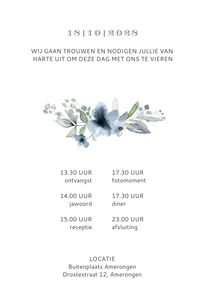 Trouwkaart bloemen met goudfolie blauw