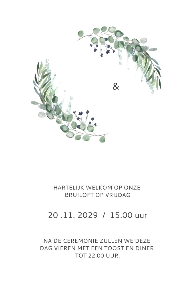 Een trouwkaart met goudfolie en eucalyptusblaadjes die je voor elk dagprogramma aan kunt passen.