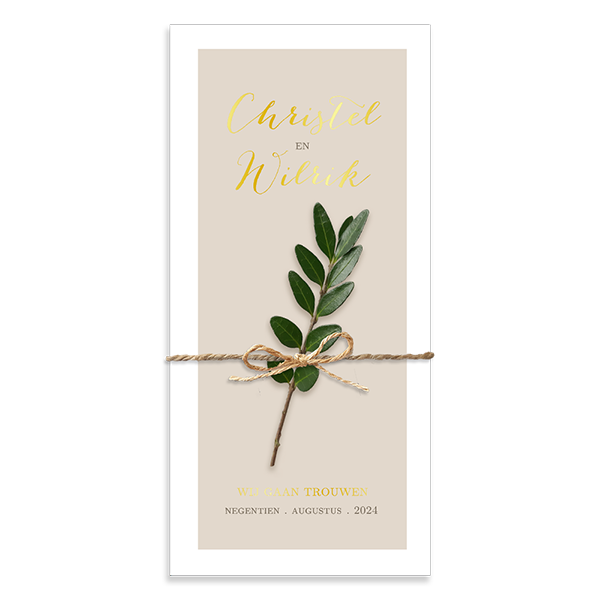 Een klassieke trouwkaart met mooie goudfolie en witte rand. De achtergrondkleur kan in de kaartopmaker aangepast worden naar elke gewenst tint die bij jullie stijl en sfeer voor de bruiloft past. Deze trouwkaart heeft het formaat 10 bij 21 cm.