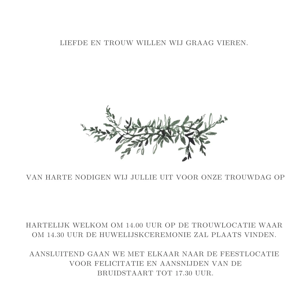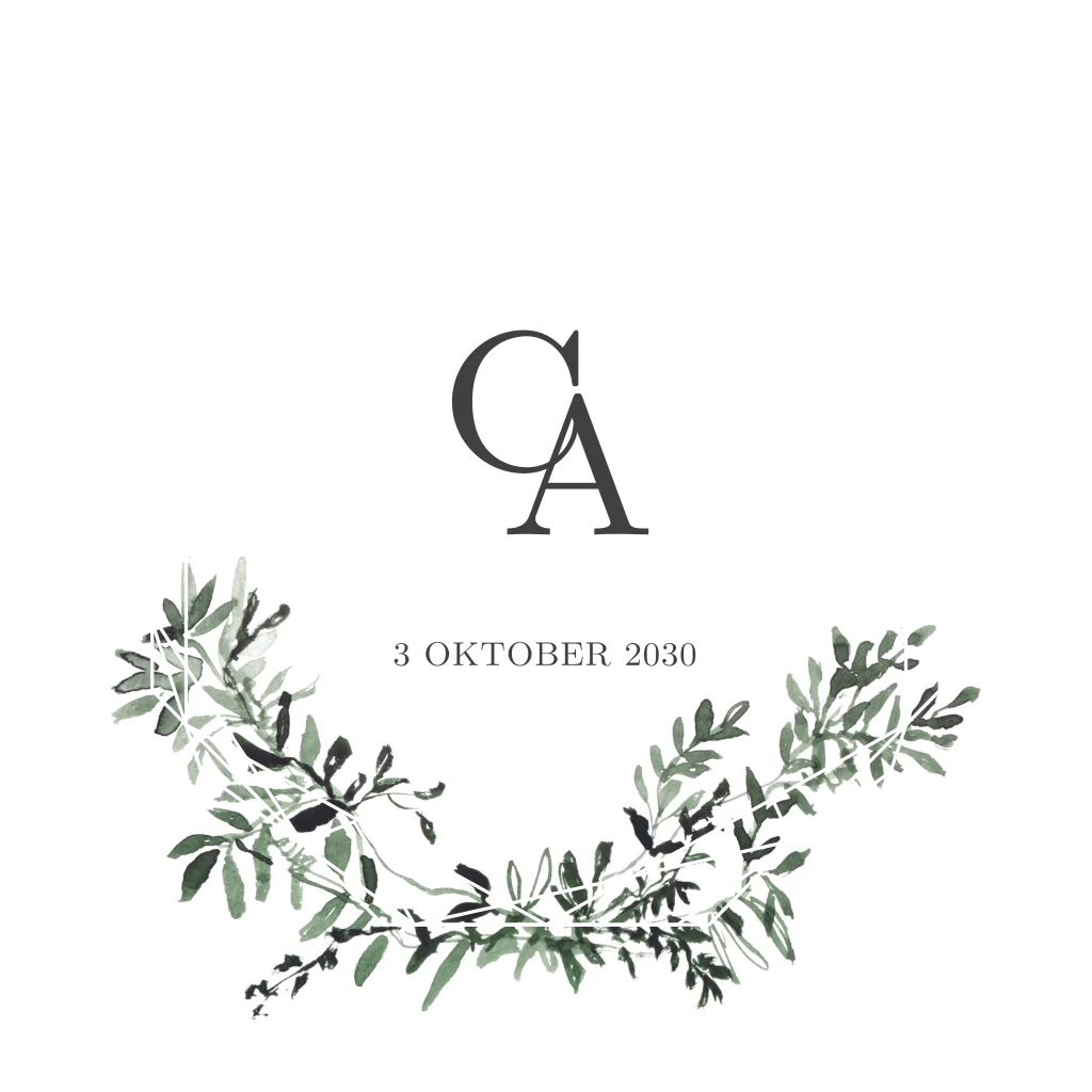 Maak jullie eigen logo op deze trendy trouwkaart met een geometrisch figuur. Om de initialen te kunnen selecteren moet je even het geometrische figuur opzij schuiven en daarna weer terug plaatsen. In de beeldbank staat een map met nog meer afbeeldingen van deze takjes: GREEN LEAVES.