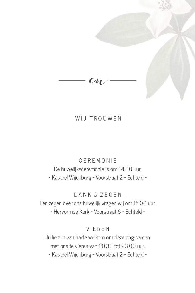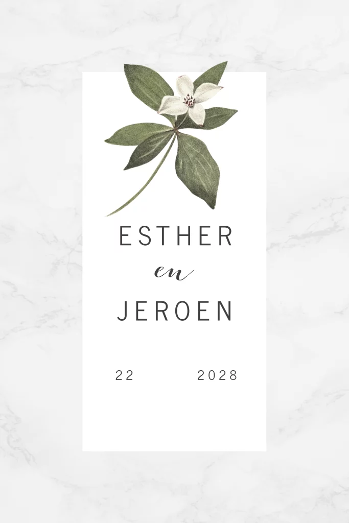 Deze trouwkaart heeft een mooi bloemetje op een marmer achtergrond. In het ontwerp zit ook echte roséfolie. Dit is een mooie glimmende folie die op de kaart ligt. In de kaartopmaker kun je een eigen ontwerp maken met dit voorbeeld. De achtergrond kun je vervangen of verwijderen. De teksten kun je aanpassen of teksten toevoegen. Daarna bestel je een proefdruk voor €2,50. Deze kaart is te bestellen in verschillende formaten op een papiersoort die wij voor foliekaarten hebben geselecteerd: Coated Karton of Linnen. Je hebt keuze uit 20+ kleuren enveloppen en andere leuke extra's.