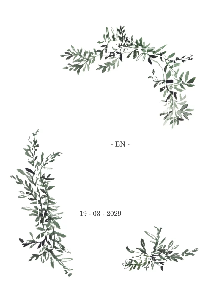 Een trouwkaart met een geometrisch figuur in zilverfolie en blaadjes. Daarbij hebben wij blaadjes geplaatst. Je kunt in de beeldbank een map vinden met de naam Mix&Match waarin meer groepjes van bloemen en blaadjes staan.