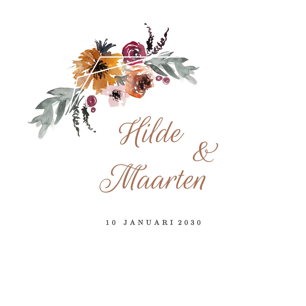 Een trouwuitnodiging met een geometrisch figuur van goudfolie en bloemen met eucalyptustakjes.