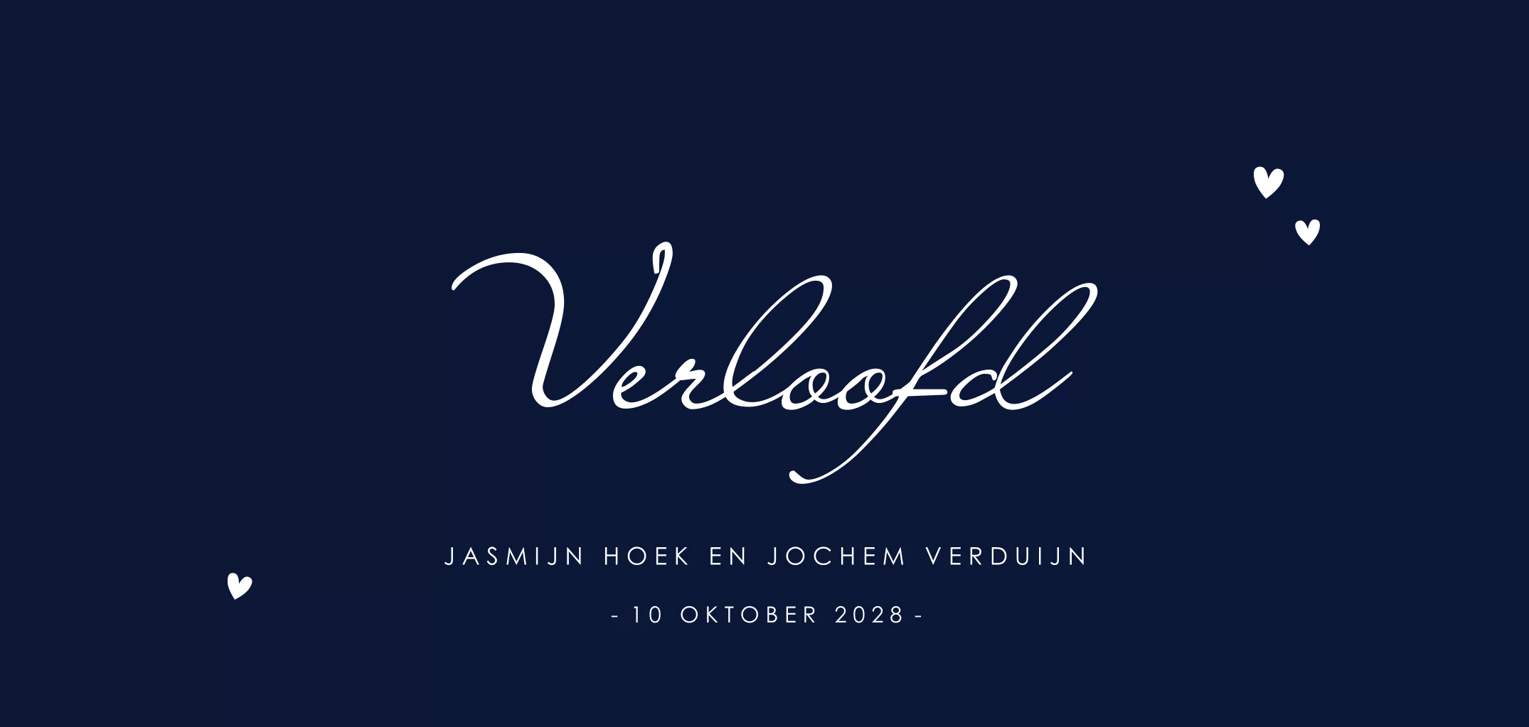 Een mooie donkerblauwe tint heeft de achtergrond van deze verlovingskaart. In de kaartopmaker kun je elke gewenste kleur kiezen. We kunnen je ook helpen bij het vinden van een specifieke kleur. Het woord Verloofd en de hartjes op de voorkant worden met echte zilverfolie gedrukt. Je kunt in de kaartopmaker dit ook aanpassen naar goudfolie of koperfolie. Op de achterkant kun je jullie eigen foto uploaden. Zo maak je altijd een unieke kaart. Het formaat van deze kaart is 10 bij 21 cm. De papiersoorten Coated Karton en Linnen zijn kiesbaar voor onze kaarten met een foliedruk. Bijpassend hebben we 20+ kleuren enveloppen.