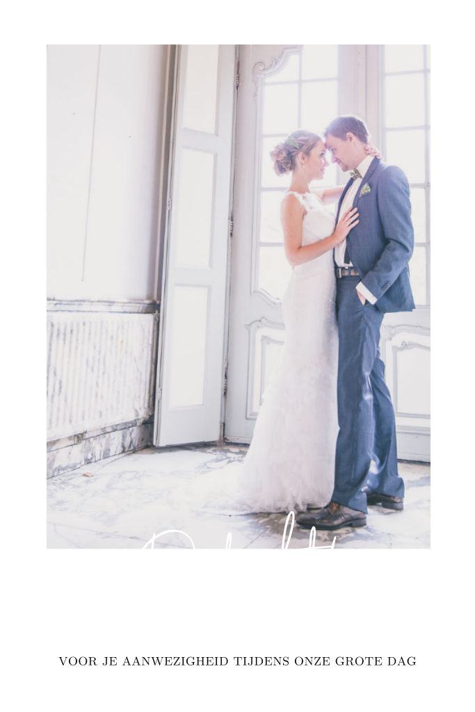 Bedankkaart met foto. Kies jullie mooiste trouwfoto uit en plaats die op deze bedankkaart. Met de teksten in goudfolie maak je zo een unieke bedankkaartjes om jullie gasten te bedanken voor hun aanwezigheid op jullie bruiloft.