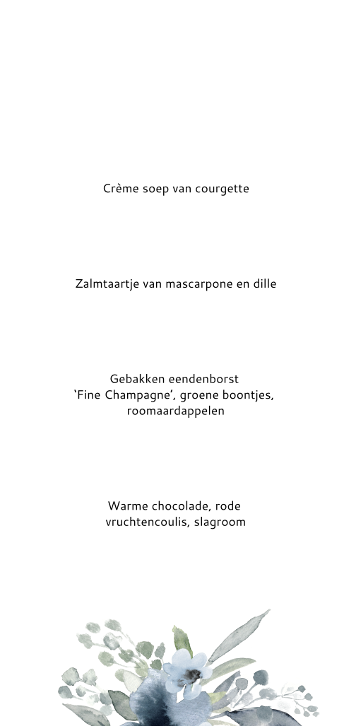 Bestel voor het diner deze prachtige menukaart met echte goudfolie. De kaart wordt gedrukt op een speciaal papiersoort dat geschikt is voor goudfolie op het formaat 10 bij 21 cm. In de kaartopmaker kun je jullie menu invullen. Daarna bestel je een proefdruk voor €2,50.