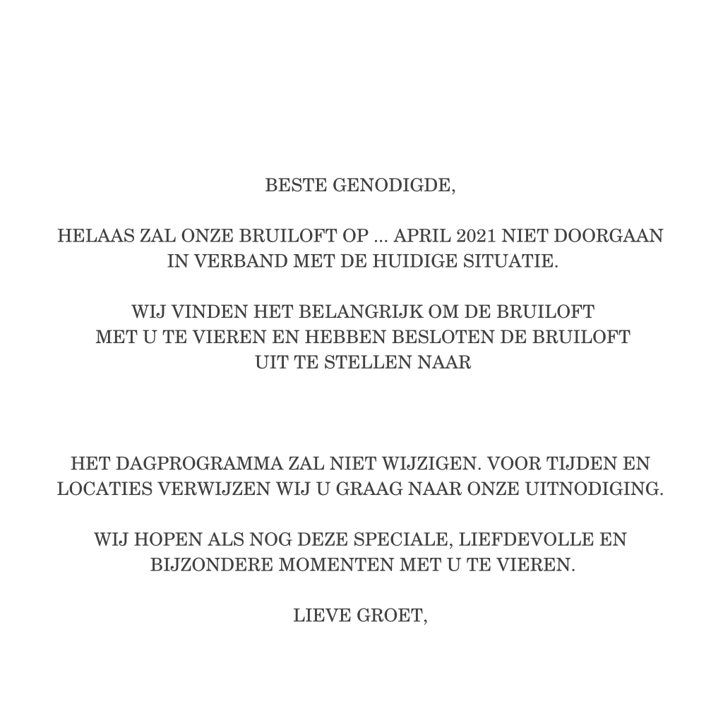 Een Change the Date kaart met goudfolie. We vinden het ontzettend jammer dat jullie de trouwdatum hebben moeten verzetten. Zo lang uitgekeken naar deze dag! Dit kaartje kunnen jullie versturen naar de genodigden om de nieuwe trouwdatum te laten weten. Alleen op de voorkant wordt goudfolie gedrukt.