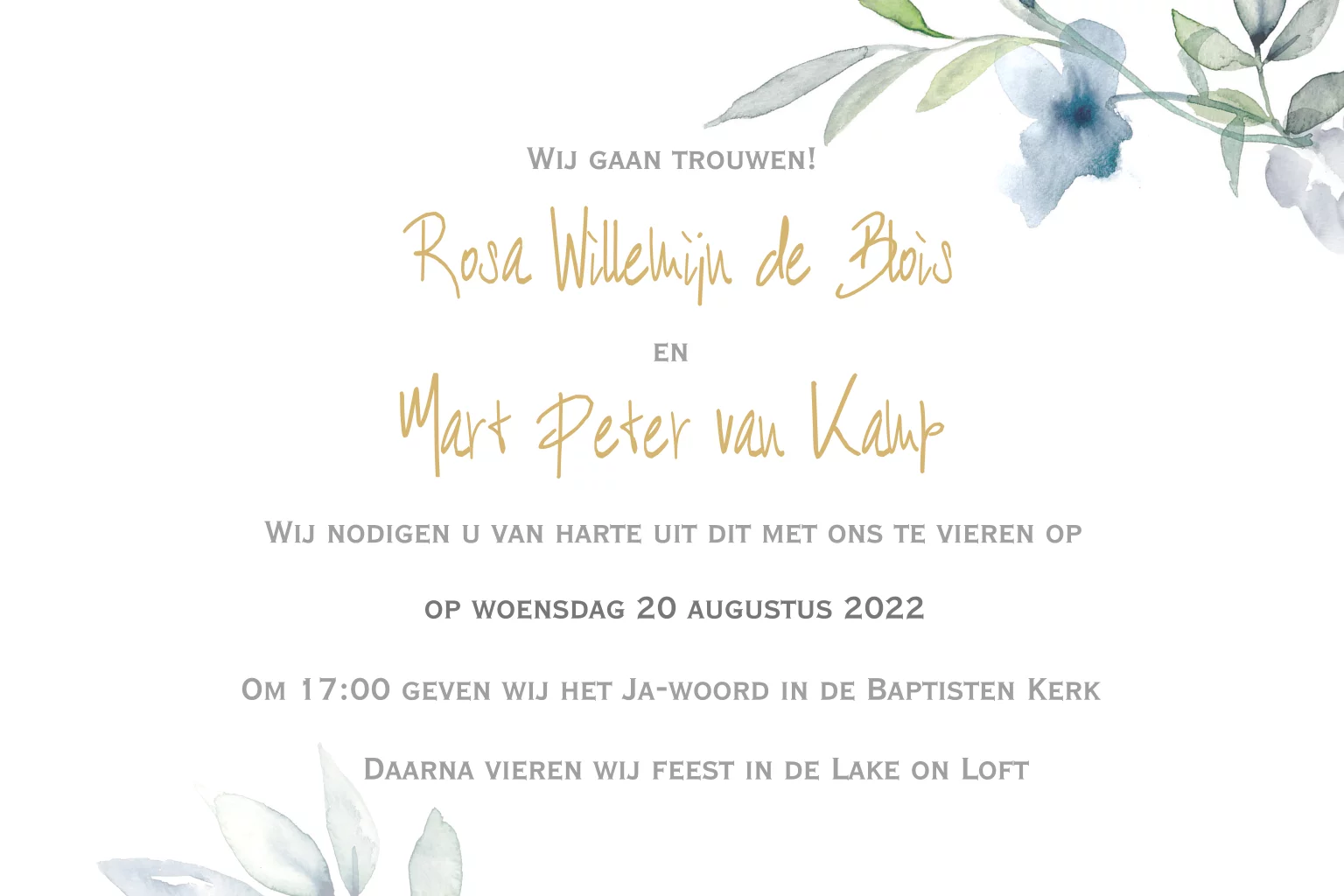 Het ontwerp op deze trouwkaart is handgemaakt. Dit zorgt voor een unieke uitstraling die je nergens anders kunt vinden. De bloemen zijn geverfd met waterverf, het goude lettertype daarbij maakt de kaart helemaal compleet.