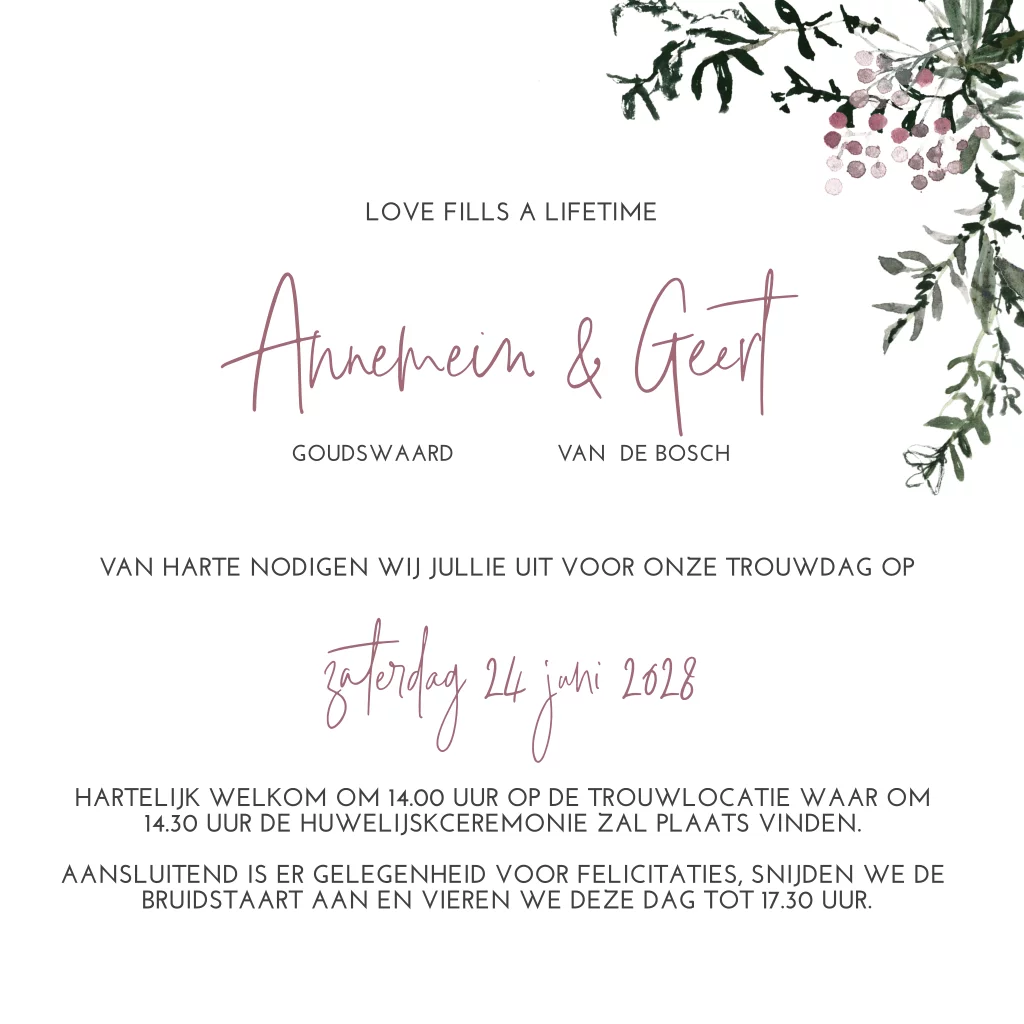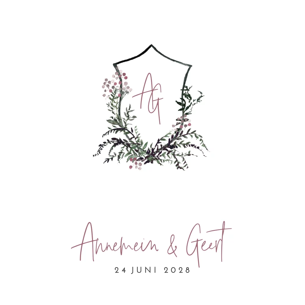 Een exclusieve trouwkaart met een schild, takjes en kleine besjes. Speciaal voor Stijlvolle Trouwkaarten getekend. In de de kaartopmaker kun je een eigen ontwerp maken van dit voorbeeld. In de beeldbank vind je een map met de naam GREEN LEAVES zodat je nog meer mogelijkheden hebt. Jullie trouwkaart wordt met dit ontwerp altijd uniek. Klik op BEWERK DEZE KAART en maak jullie trouwkaart. Bestel daarna een proefdruk.