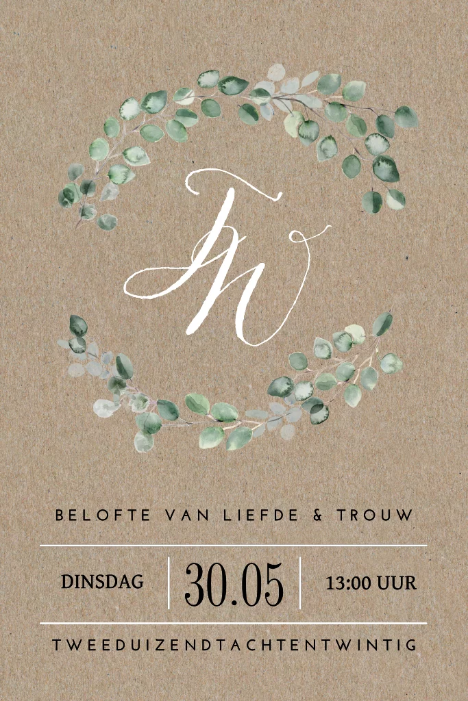 Een kraft trouwkaart met botanische takjes van eucalyptus. Te bestellen in verschillende formaten. Gedrukt op mooi stevig kraft papier.