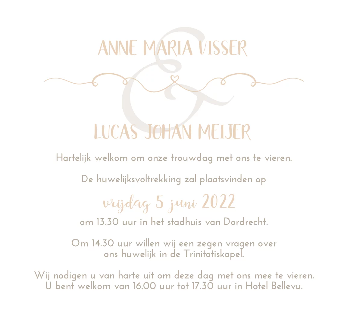 Deze trouwkaart heeft een speciaal formaat voor onze Belgische klanten. Alleen te bestellen op het formaat 13 bij 12 cm. Bpost zal geen extra portokosten in rekening brengen.