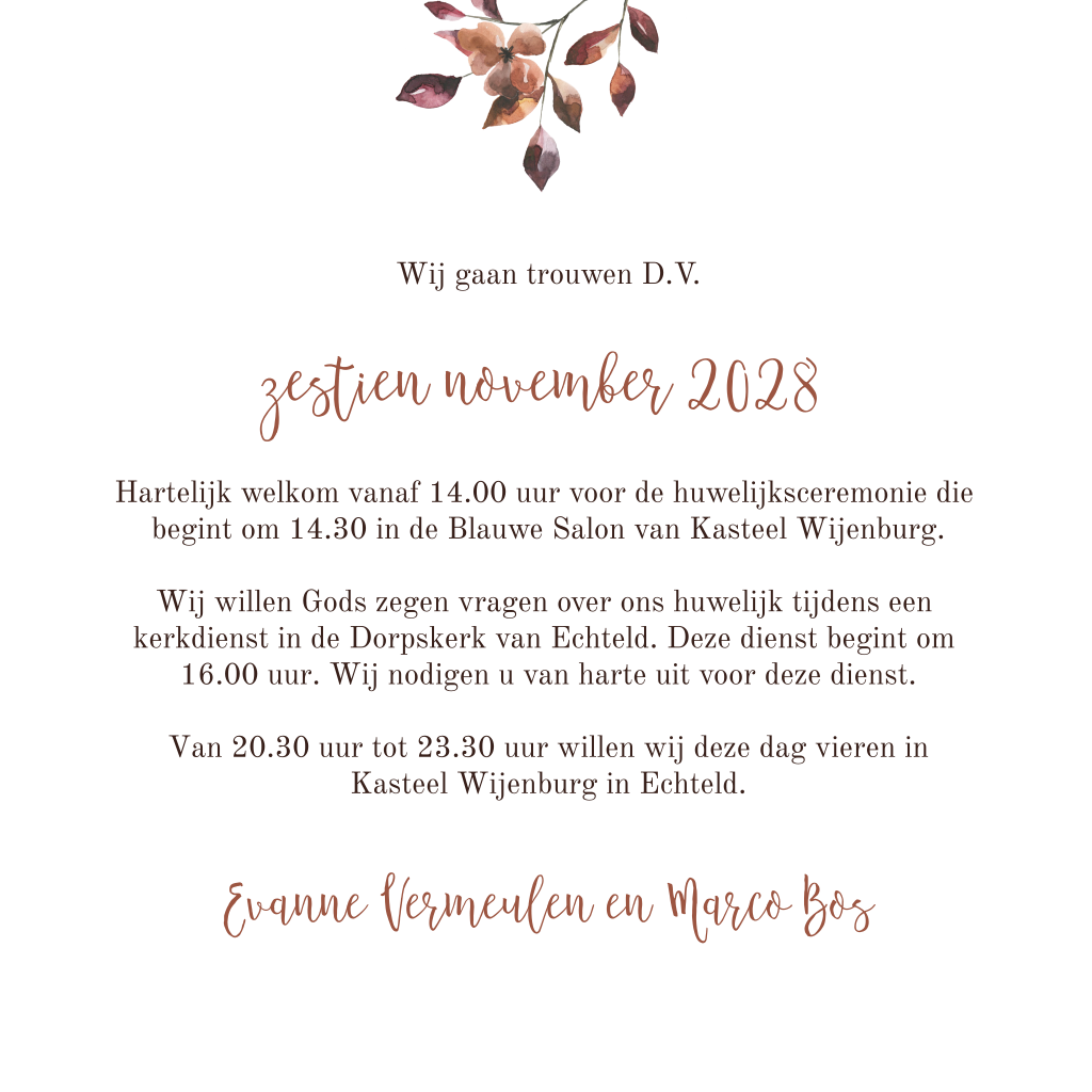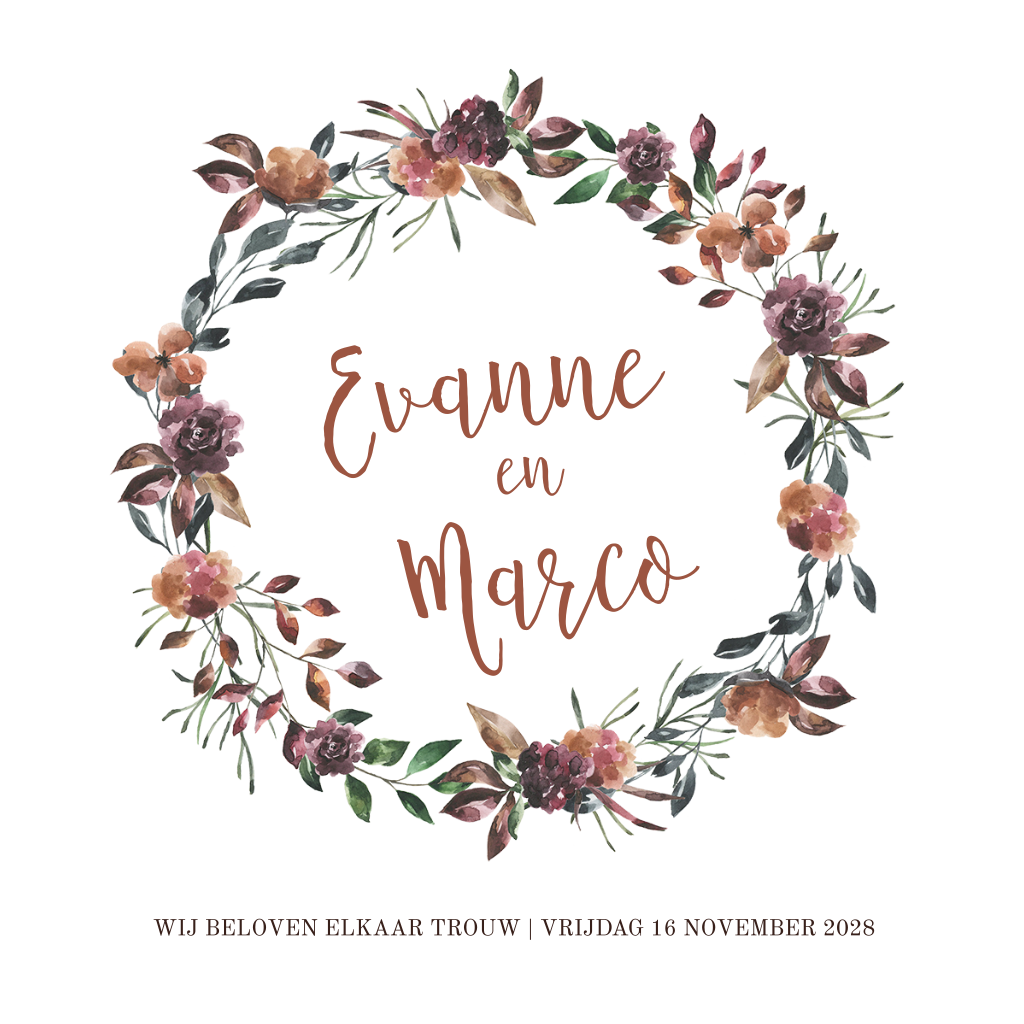 Een trouwkaart met een mooi kransje van herfst bloemen. Deze tinten passen bij een herfst of winter bruiloft.