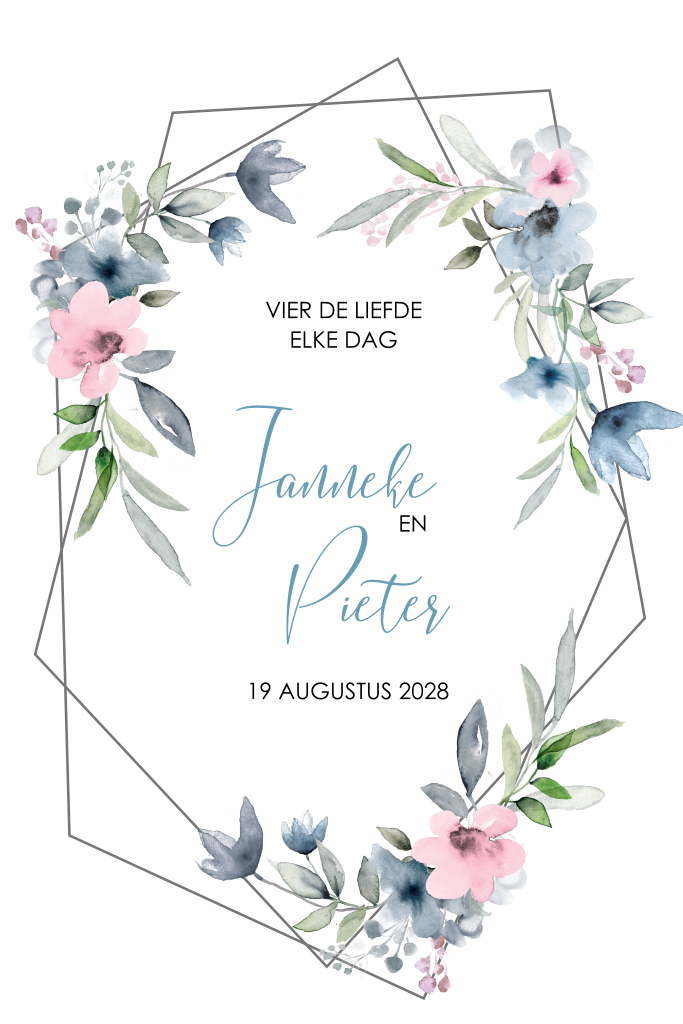 Romantische huwelijksuitnodiging met bloemetjes en geometrie