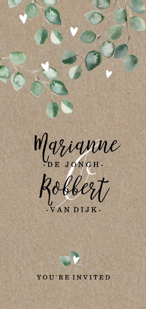 Een botanische trouwkaart die op kraftpapier gedrukt wordt. Een mooie stoere uitstraling. Deze trouwkaart wordt gedrukt op het formaat 10 bij 21 cm.