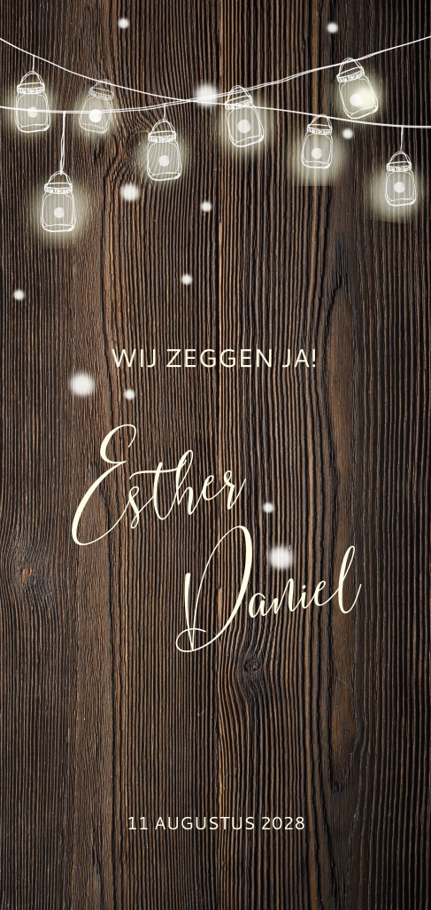 Passen deze lampjes aan een slinger bij de sfeer van jullie bruiloft? Ga dan naar de kaartopmaker om een uniek ontwerp te maken en een proefdruk te bestellen.