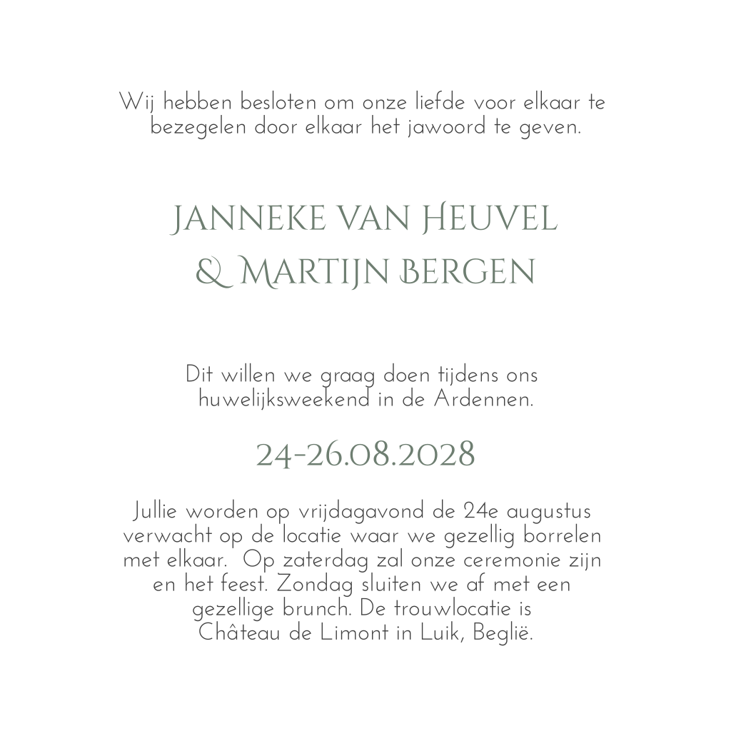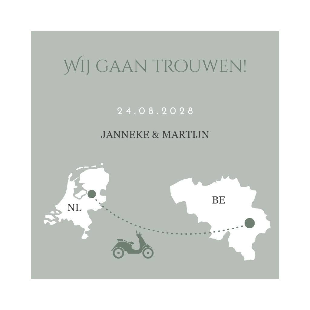 Trouwkaart voor een bruiloft in het buitenland. Dit voorbeeld heeft België als land, maar je kunt ook een ander land op deze kaart plaatsen. In de kaartopmaker vind je een map met veel verschillende landen. Die van jullie staat er vast bij!