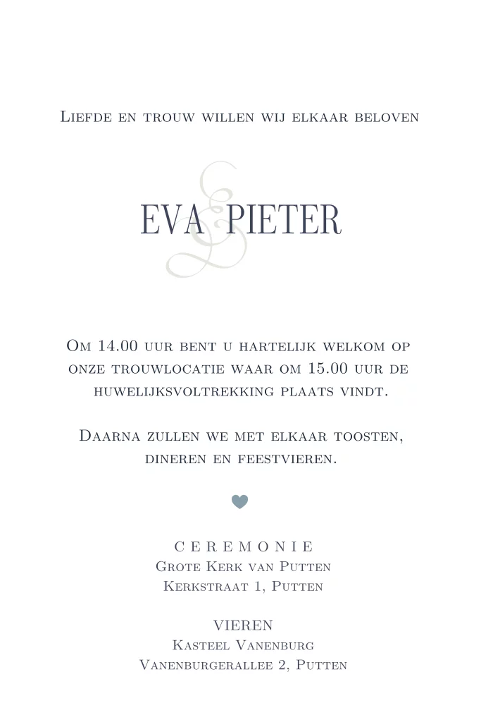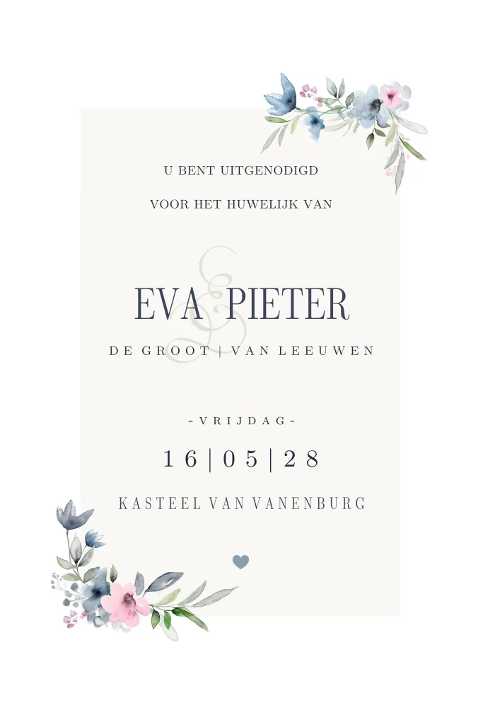 Kleine details van bloemetjes in de hoeken heeft deze trouwkaart. Je kunt deze trouwkaart op verschillende formaten laten drukken. Ook heb je keuze uit 5 verschillende papiersoorten. Ga naar de kaartopmaker om een uniek ontwerp te maken.