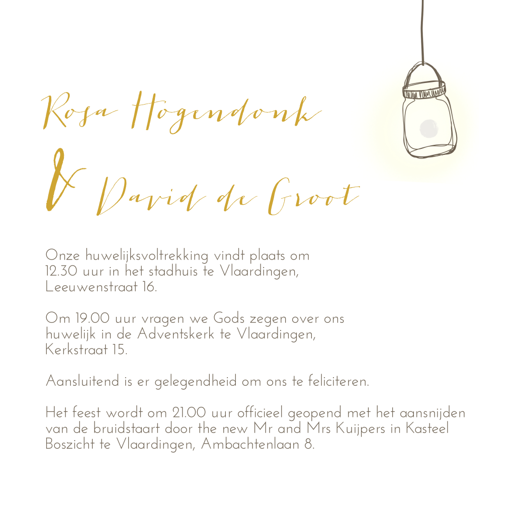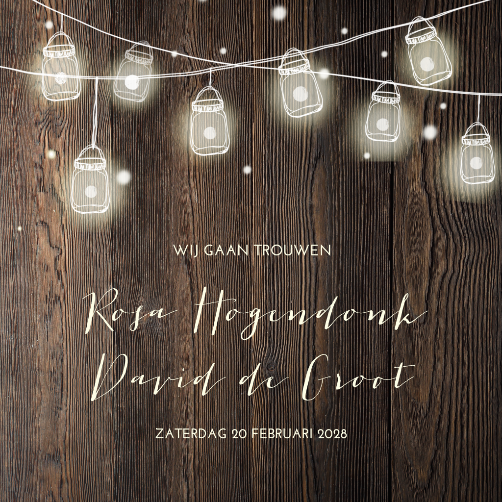 Sfeervolle trouwkaart met lampjes voor gezellige bruiloft