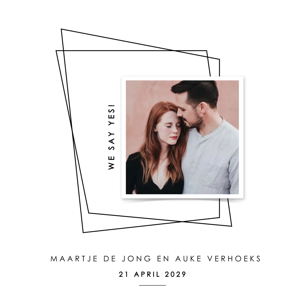 Een moderne trouwkaart met foto en geometrische lijnen. Combineer strak modern met een mooie foto van jullie zelf. Past goed bij een bruiloft met een moderne sfeer.