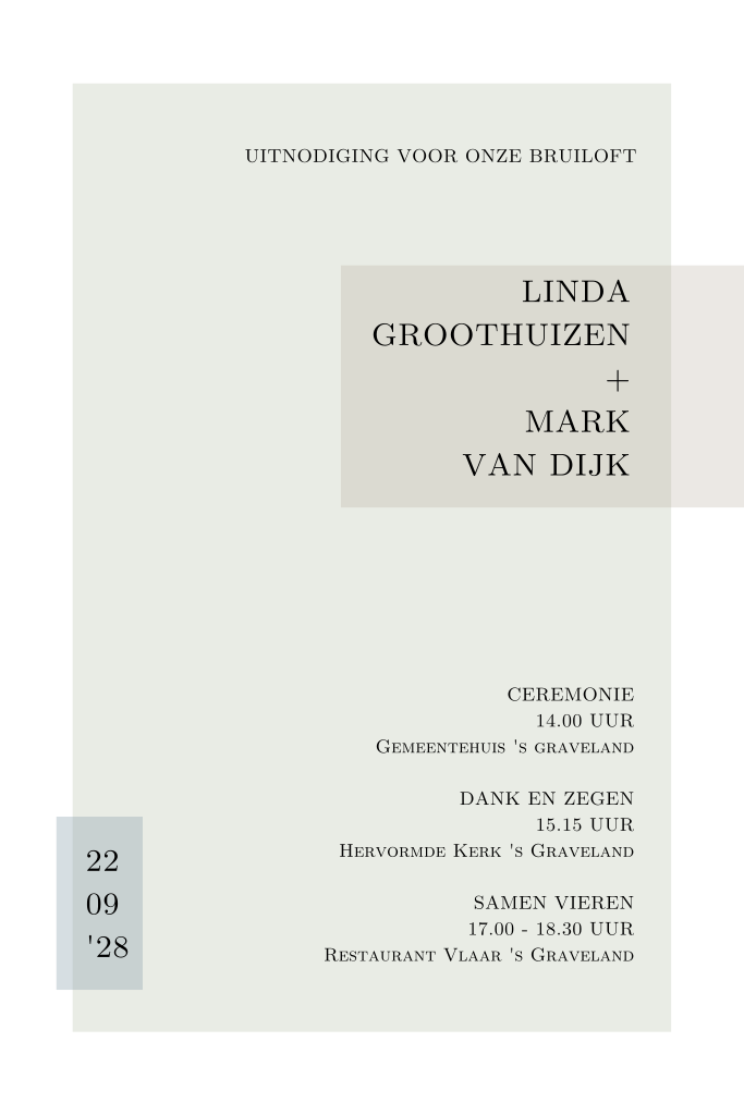 Mooie pastel tinten heeft deze trouwkaart. Je kunt de vlakken andere kleuren geven of verplaatsen in de kaartopmaker. Zo maak je altijd een passende trouwkaart in de kaartopmaker voor jullie bruiloft. Bestel daarna een proefdruk!