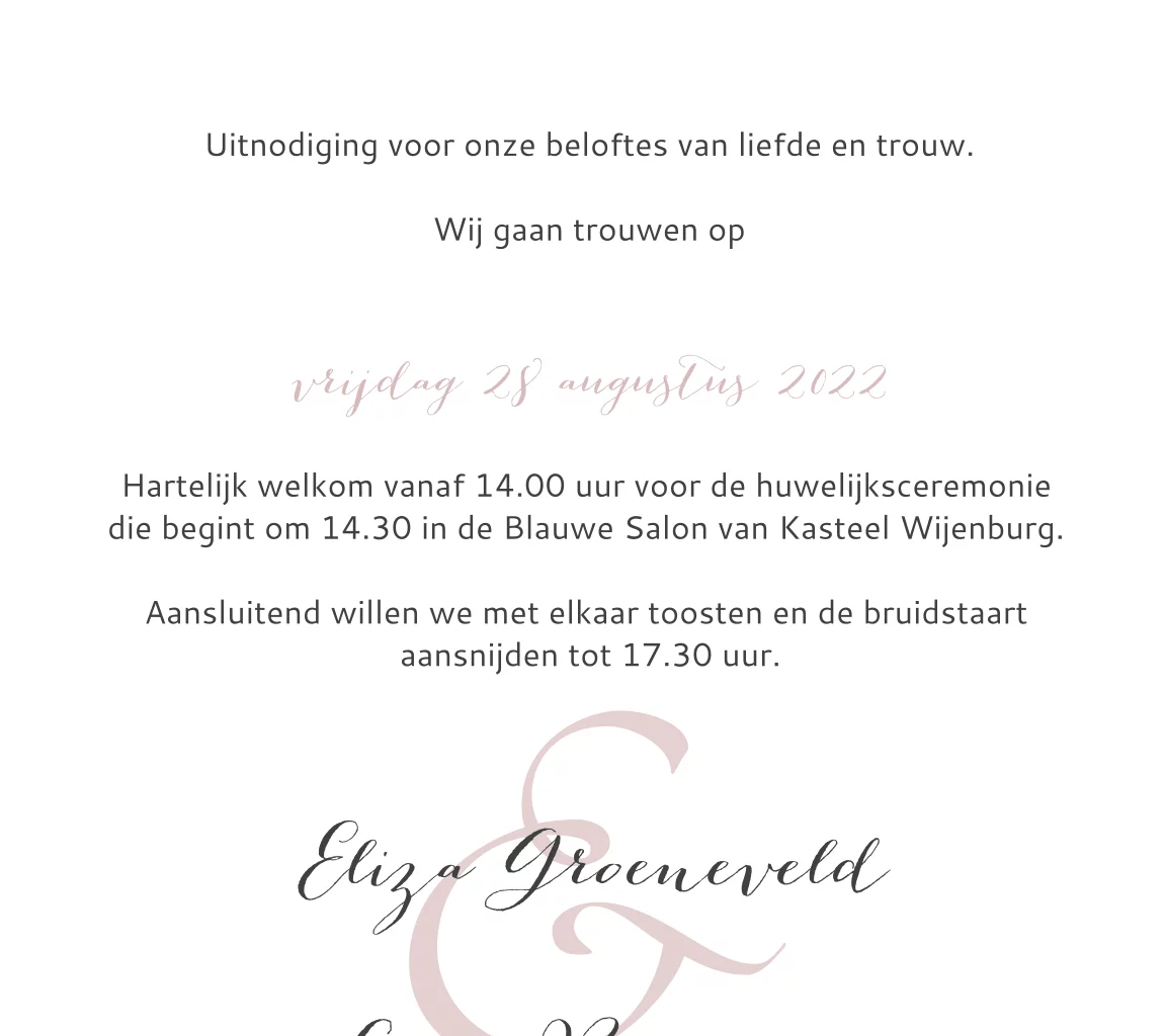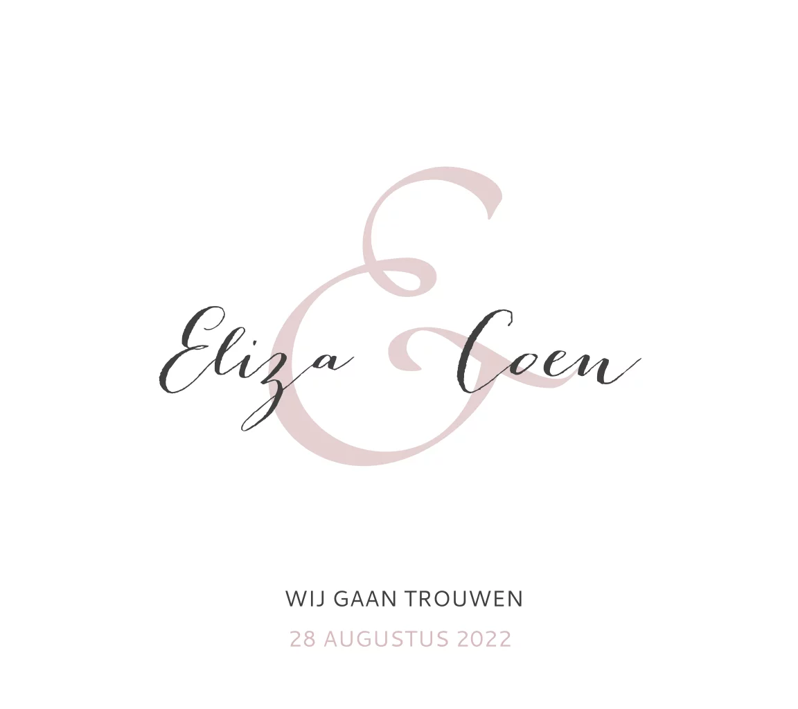 Leuk trendy trouwkaart omdat aan jullie namen een verlengd lijntje zit. Kijk goed naar het voorbeeld in de kaartopmaker. Als het niet lukt om de lijntjes te maken, neem dan contact met ons op want we helpen jullie graag.