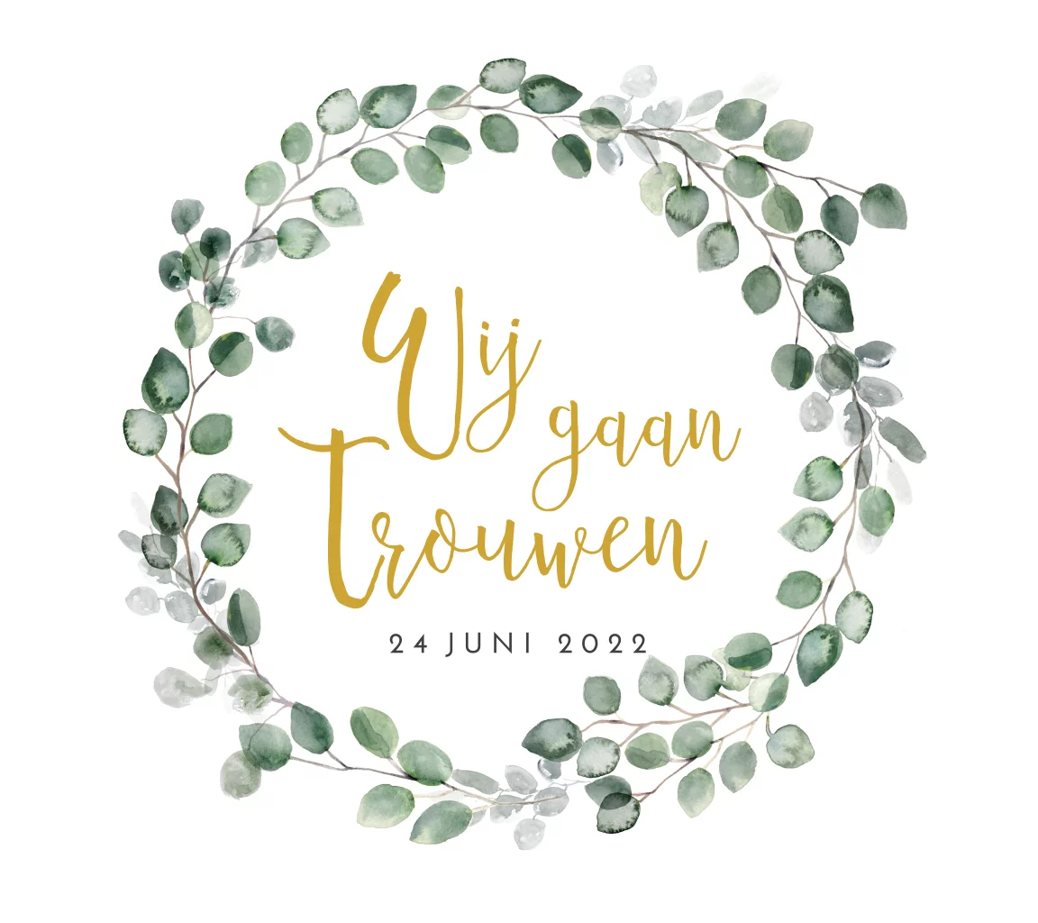 Trendy trouwkaart met eucalyptus takjes die in de kaartopmaker aan te passen is naar jullie wensen.