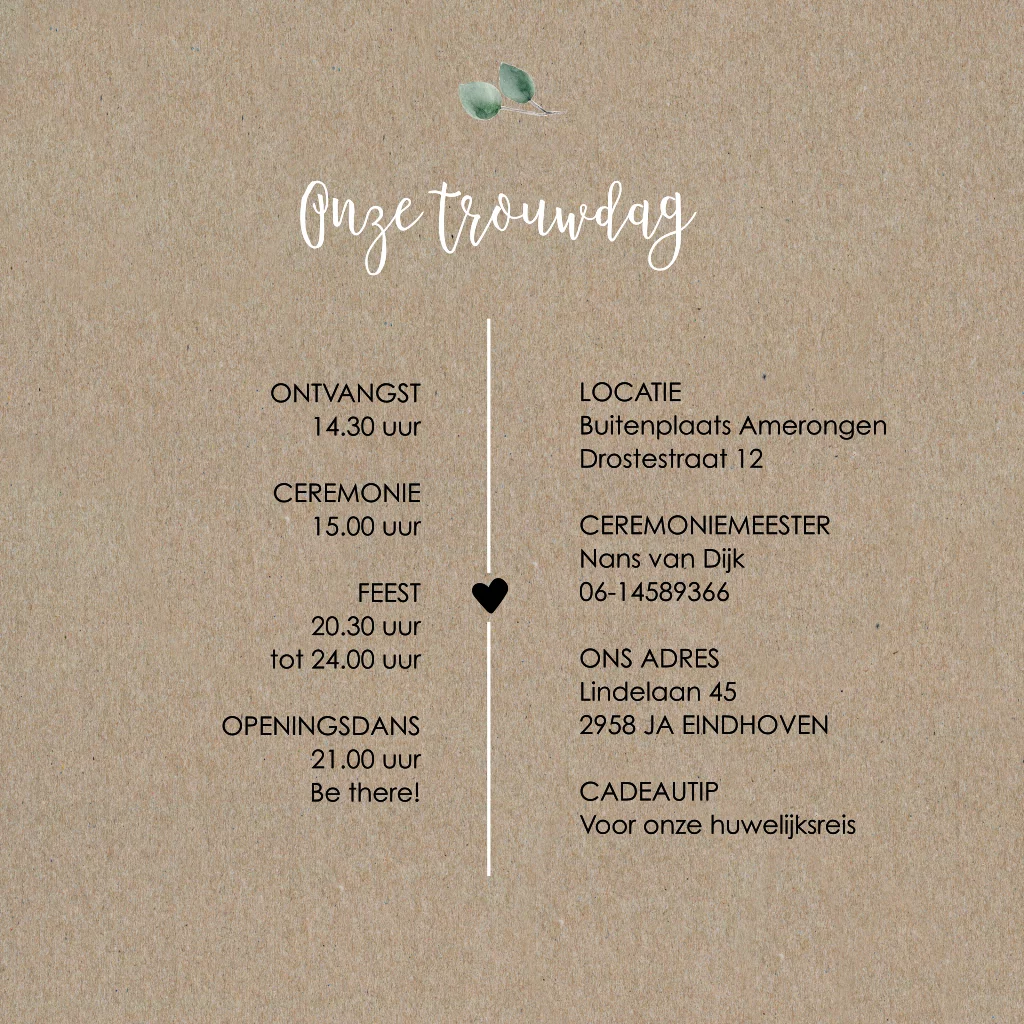 Vintage trouwkaart op kraft met eucalyptus en icoontjes