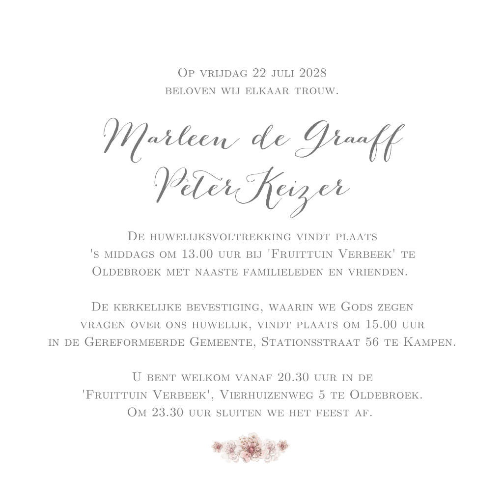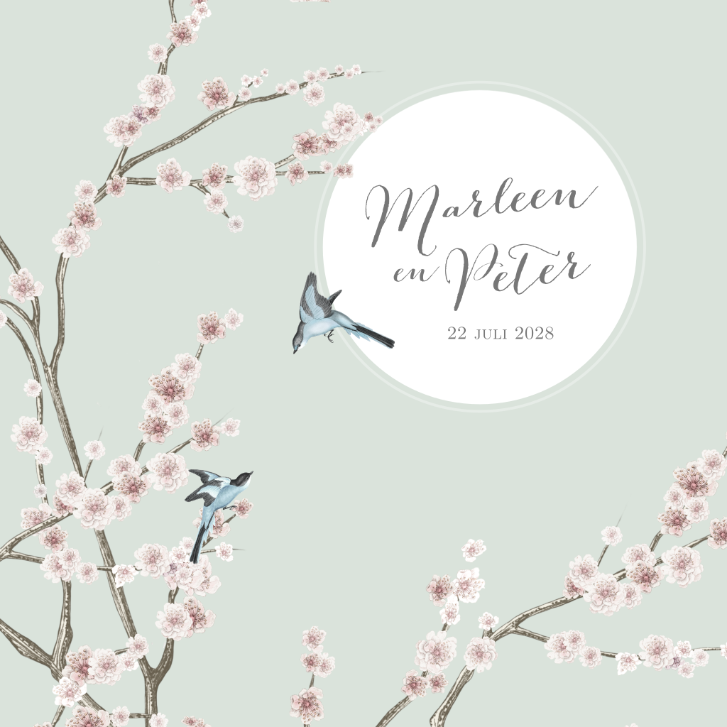 Unieke takken met bloesem en 2 schattige vogeltjes maken deze bijzondere trouwkaart. Je kunt in de kaartopmaker aanpassingen doen zodat deze kaart bij jullie dagprogramma voor de bruiloft past.