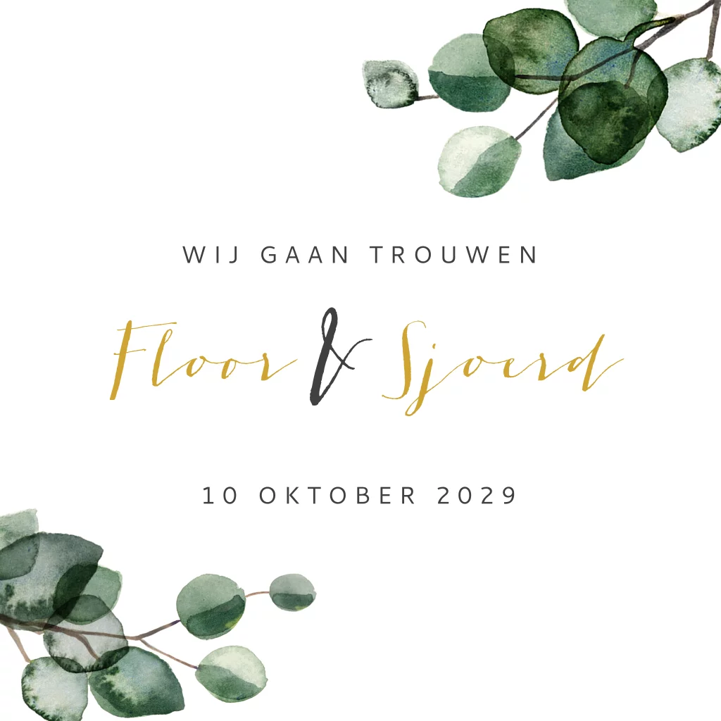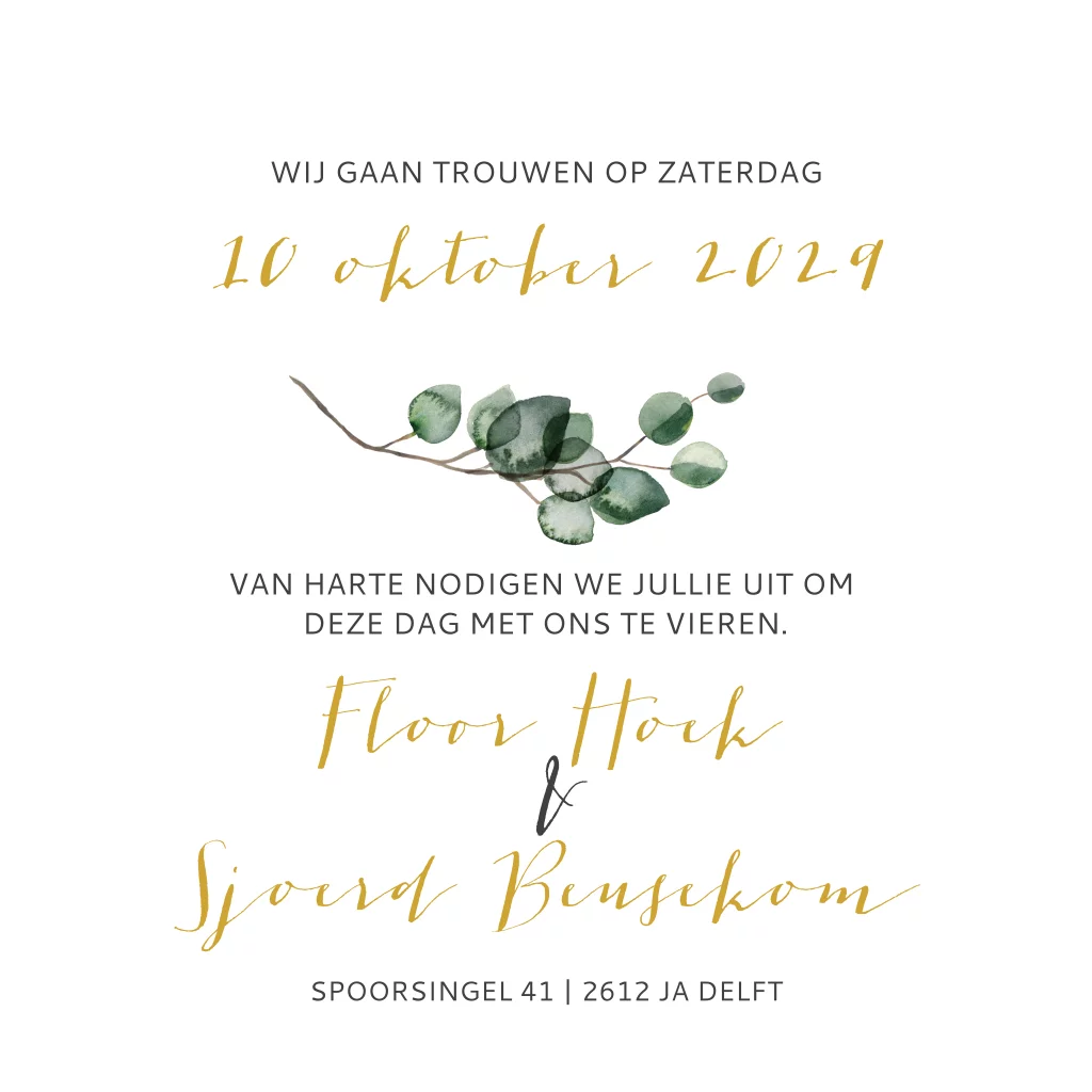 Ontwerp een mooie trouwkaart met deze mooie eucalyptus blaadjes. De teksten hebben een goudkleur. Dat wil zeggen dat ze niet met goudfolie worden gedrukt.